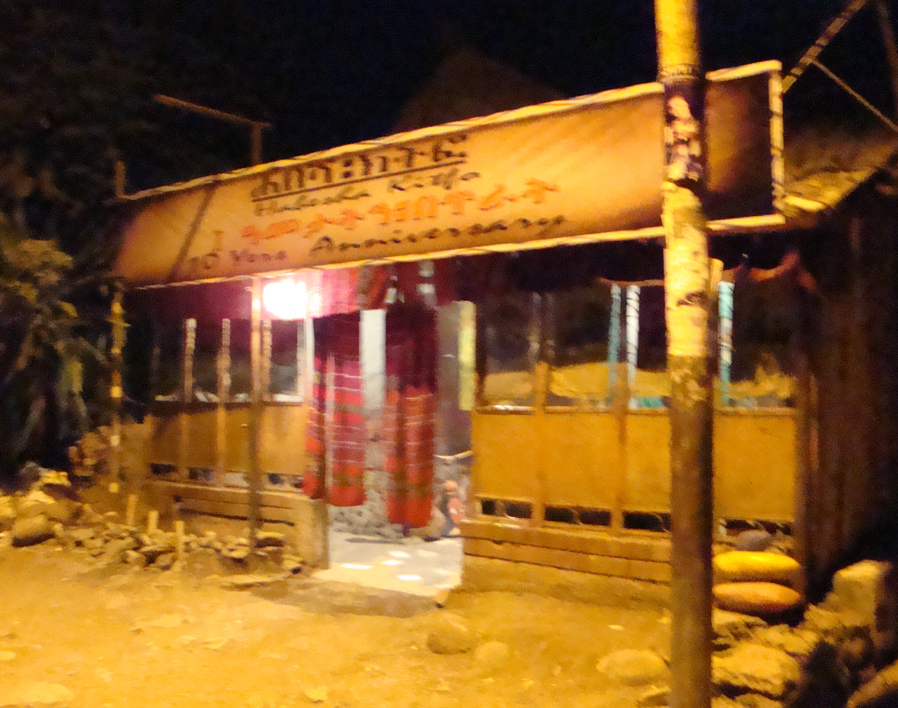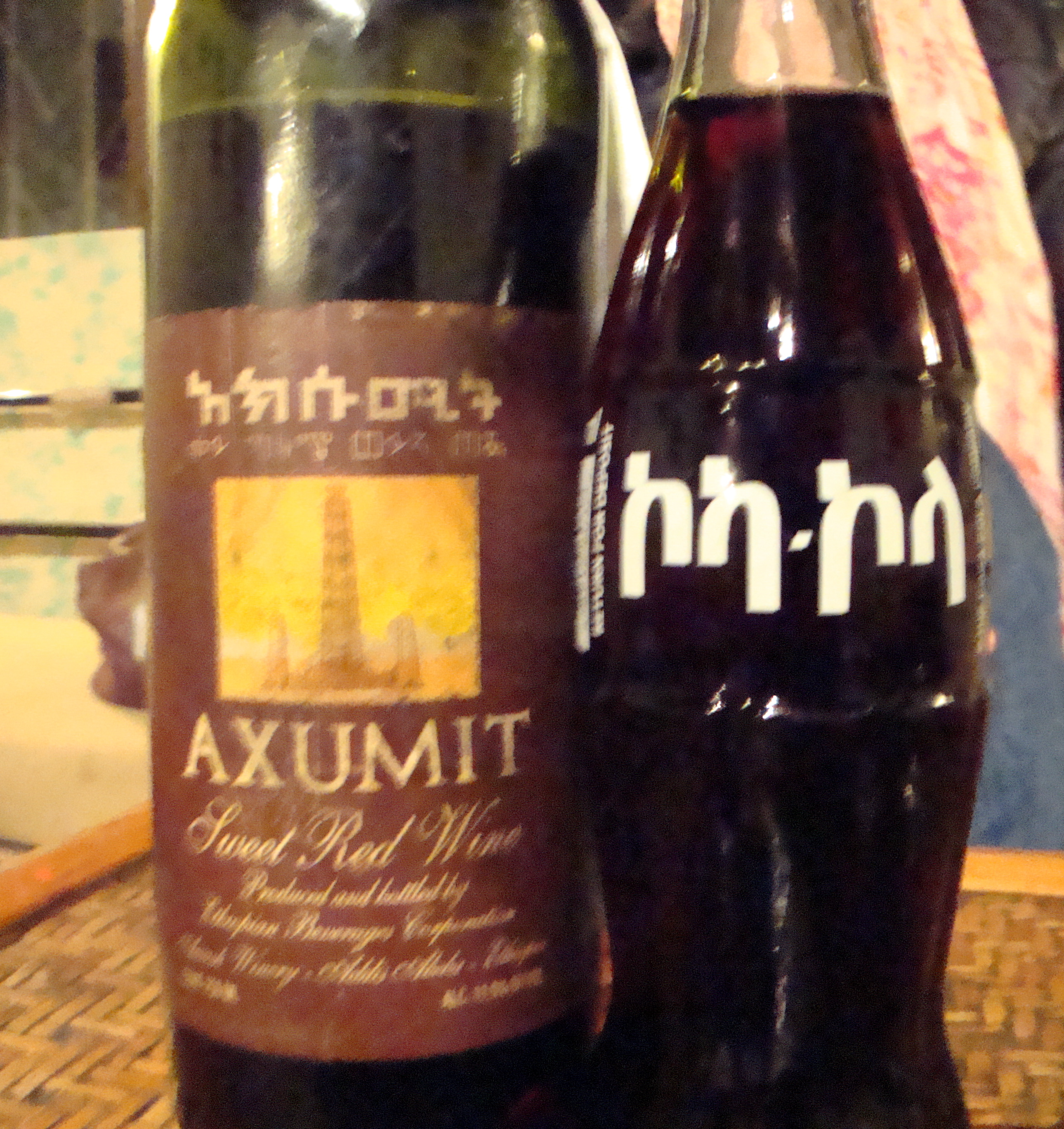 A celebratory dinner for three included eggs scrambled, local cheese, tibs (grilled meat), kitfo (raw-minced beef) and red wine mixed with Coke, and cost 100 Birr ($5.00).